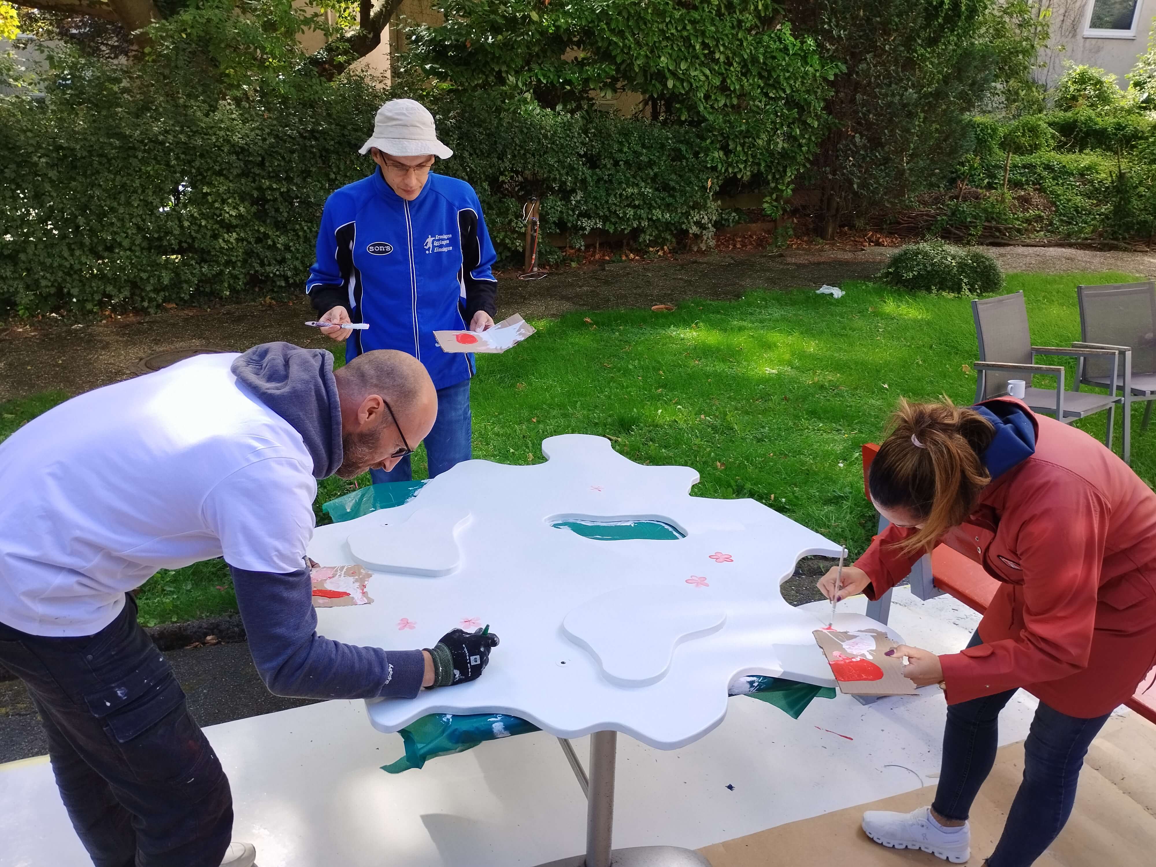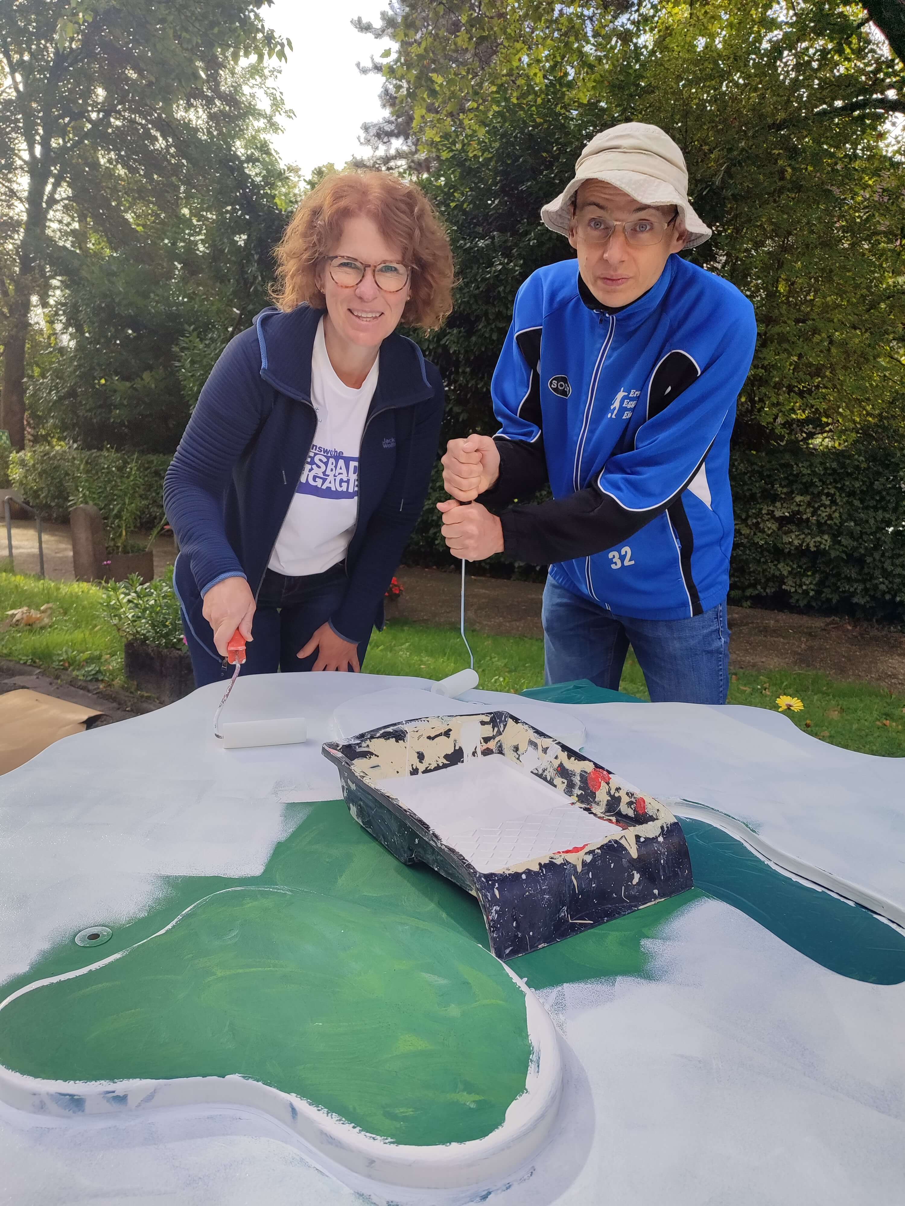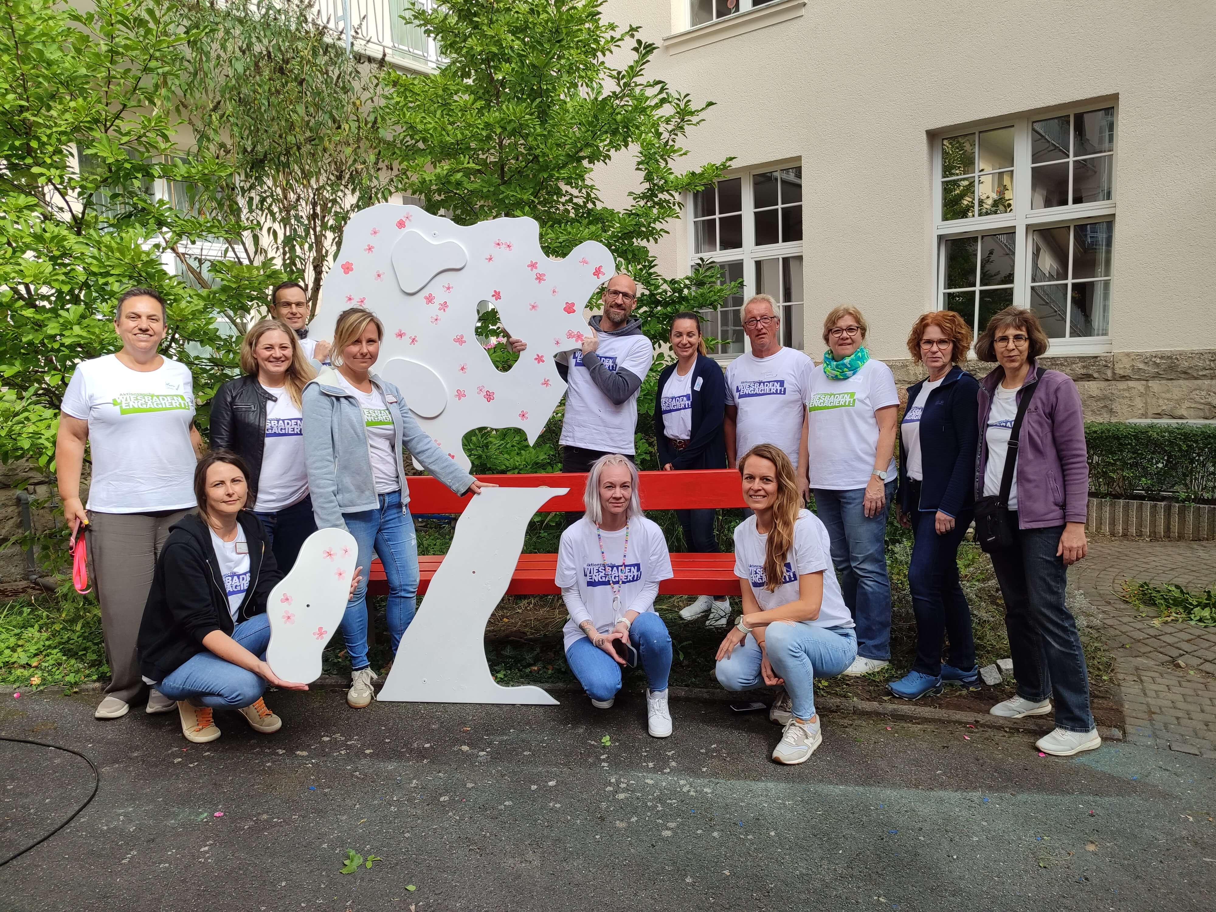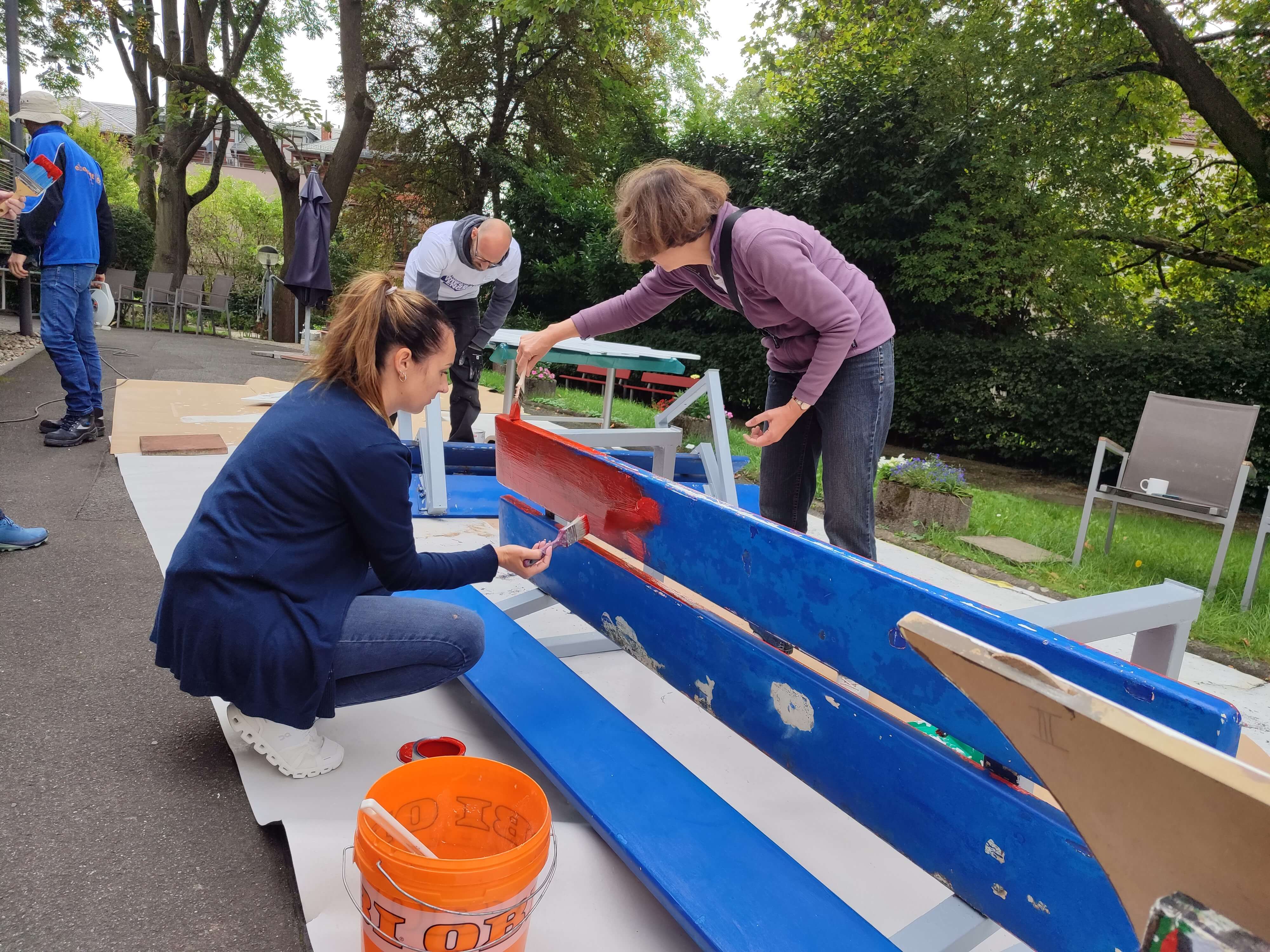 Neben der kreativen Neugestaltung blieb sogar noch Zeit, unsere in die Jahre gekommenen Gartenbänke abzuschleifen und ihnen mit frischem Lack im typischen AWO-Rot neues Leben einzuhauchen.